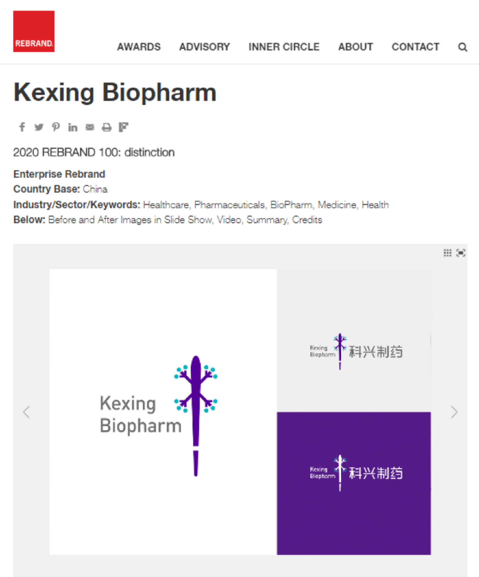 On February 28, 2020, the final winners of the 2020 REBRAND 100? Global Awards were announced. A total of 100 entrants from around the globe became the recipients of awards in the three categories: Best of Awards, Distinction, and Merit. Only five entries scoring the highest among 100 recipients racked up the Best of Awards, 45 with lower scores won the Distinction, and, in the near future, the remaining 50 Merit winners will be announced on Rebrand's website in the form of gallery showcase. Kexing Biopharm entered the final list of the 2020 Distinction winners with its brand visual upgrading program developed by MetaThink.