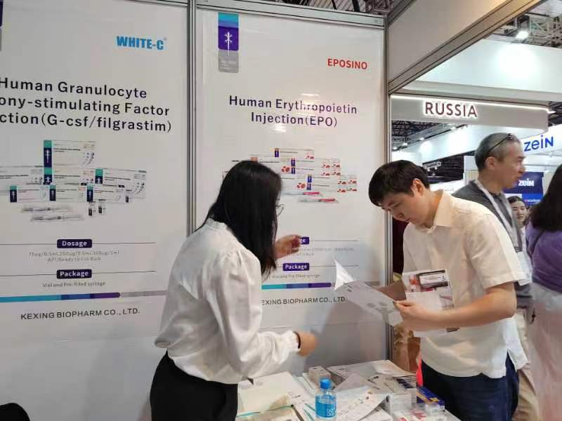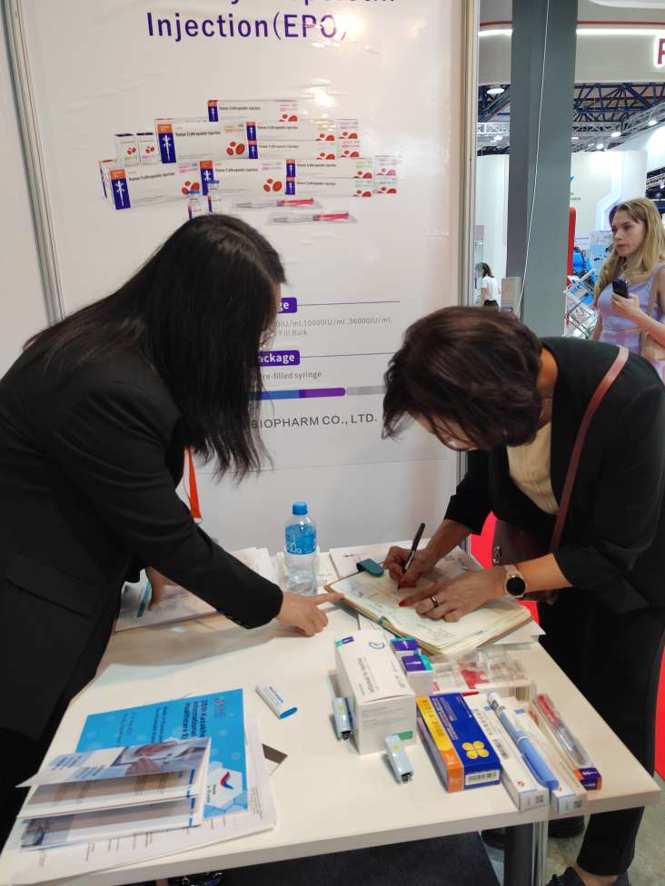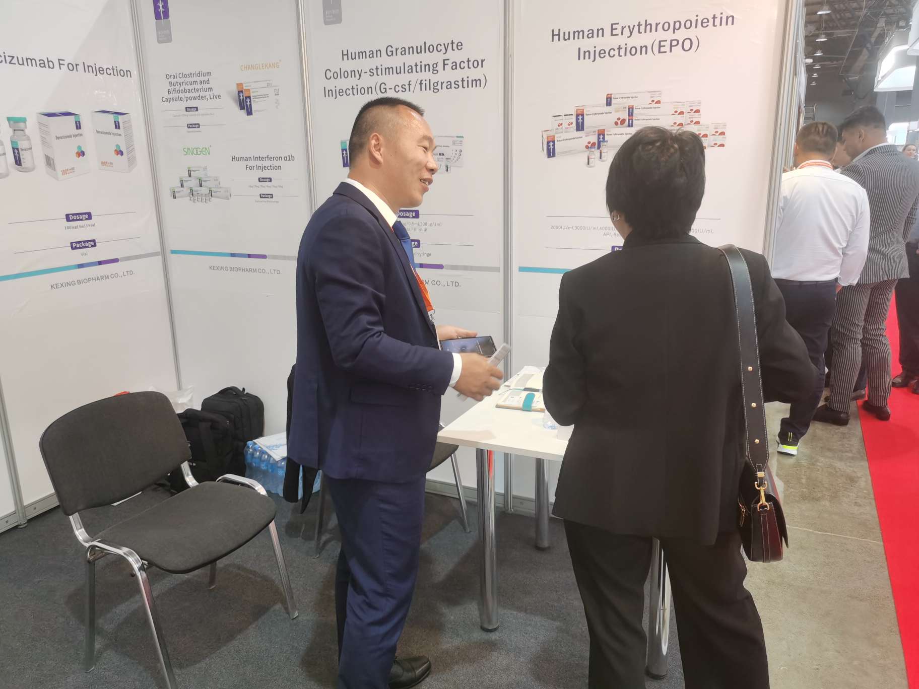 在本次展會上,科興制藥攜人促紅素EPOSINO、人粒細胞刺激因子WHITE-C、貝伐珠單抗ARKETIN、英夫利西單抗Reminton、白蛋白紫杉醇、阿達木單抗Ahrasin、利拉魯肽等多款出海產(chǎn)品亮相,吸引了眾多海外客戶前來展臺咨詢,共接待50余家醫(yī)藥企業(yè),收獲頗豐。同時,通過展會橋梁,與客戶面對面交流市場前沿信息,極大增強了客戶與科興制藥的合作信心,進一步鞏固科興制藥在國際醫(yī)藥供應(yīng)鏈體系中的優(yōu)勢地位。