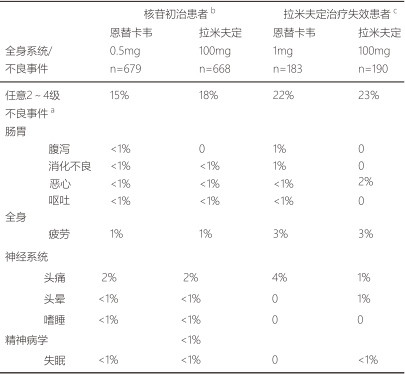 表2比較了在4項臨床研究中恩替卡韋和拉米夫定的不同。其中選擇了中到重度不良事件和治療過程中發(fā)生的至少有可能與治療相關(guān)的臨床不良事件作為比較的指標(biāo)。