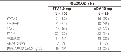 96周期間,ETV組和ADV組治療相關(guān)的2-4級AEs發(fā)生率相似(分別是13%和16%)。